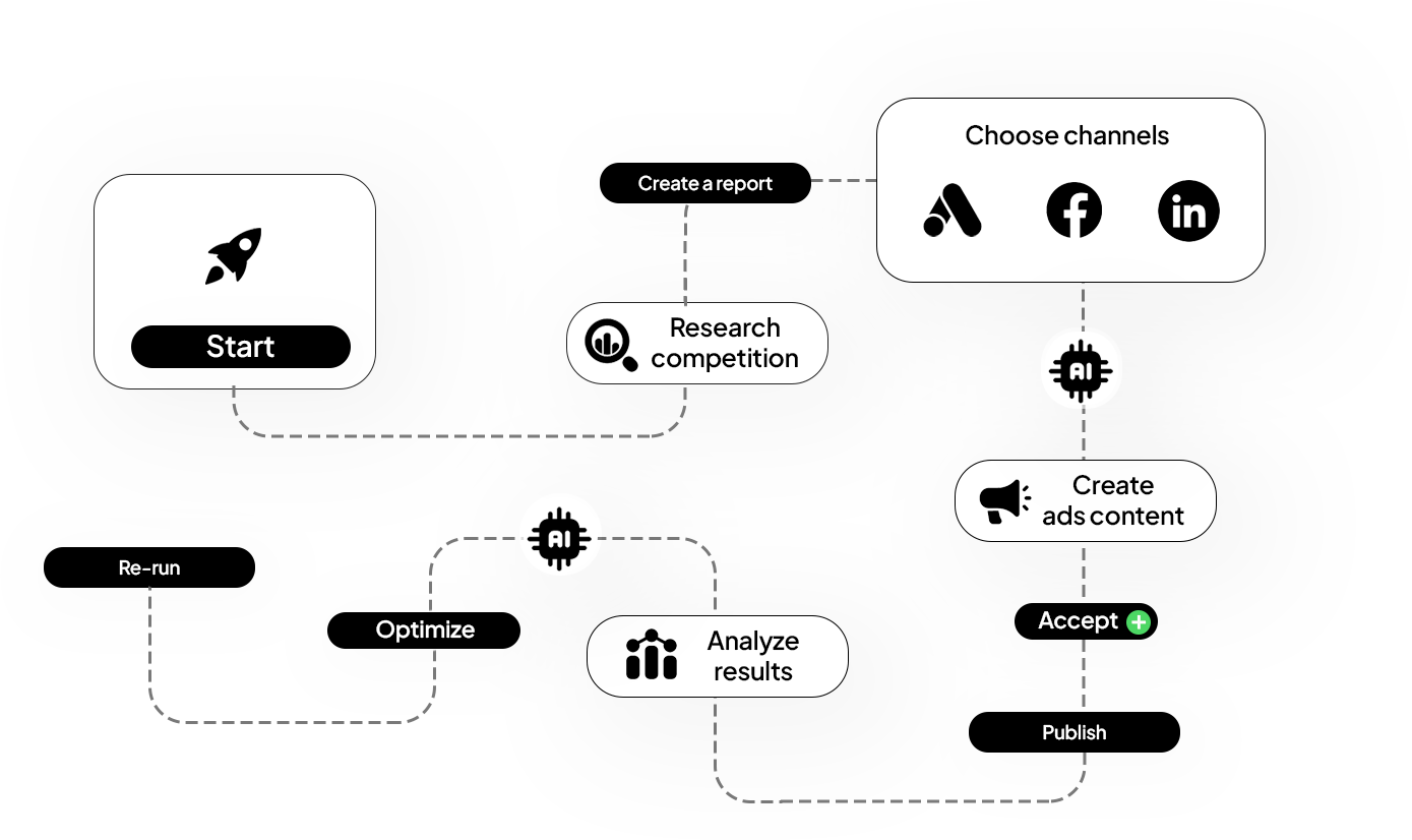 Tworzenie, uruchamianie i optymalizacja kampanii reklamowych nie musi zajmować godzin. Dzięki automatyzacji cały proces – od przygotowania kreacji, przez konfigurację kampanii, aż po raportowanie – przebiega niemal bezobsługowo. Masz pełną kontrolę, a jednocześnie oszczędzasz czas i budżet reklamowy.